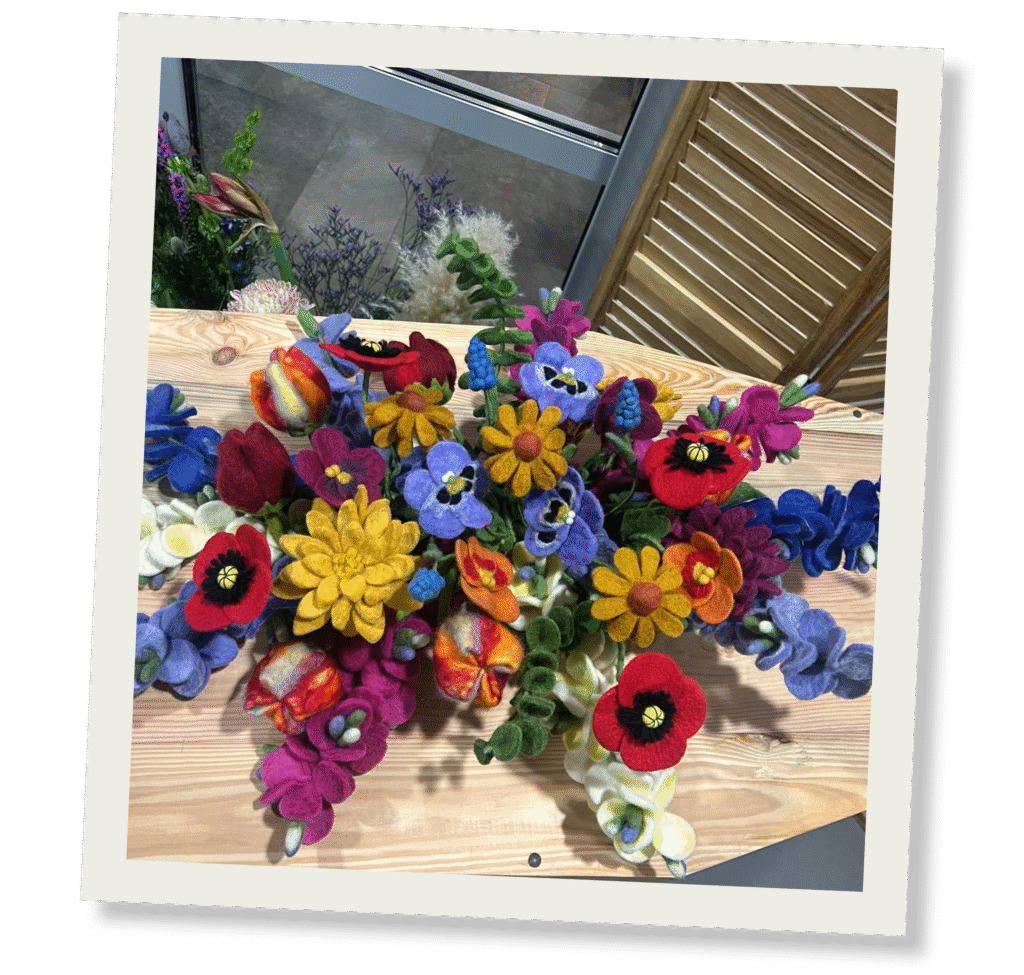 De bloemen van wolvilt zijn zacht, kleurrijk en blijvend mooi. Ze verwelken niet, maar brengen wél diezelfde warmte en vrolijkheid in huis.