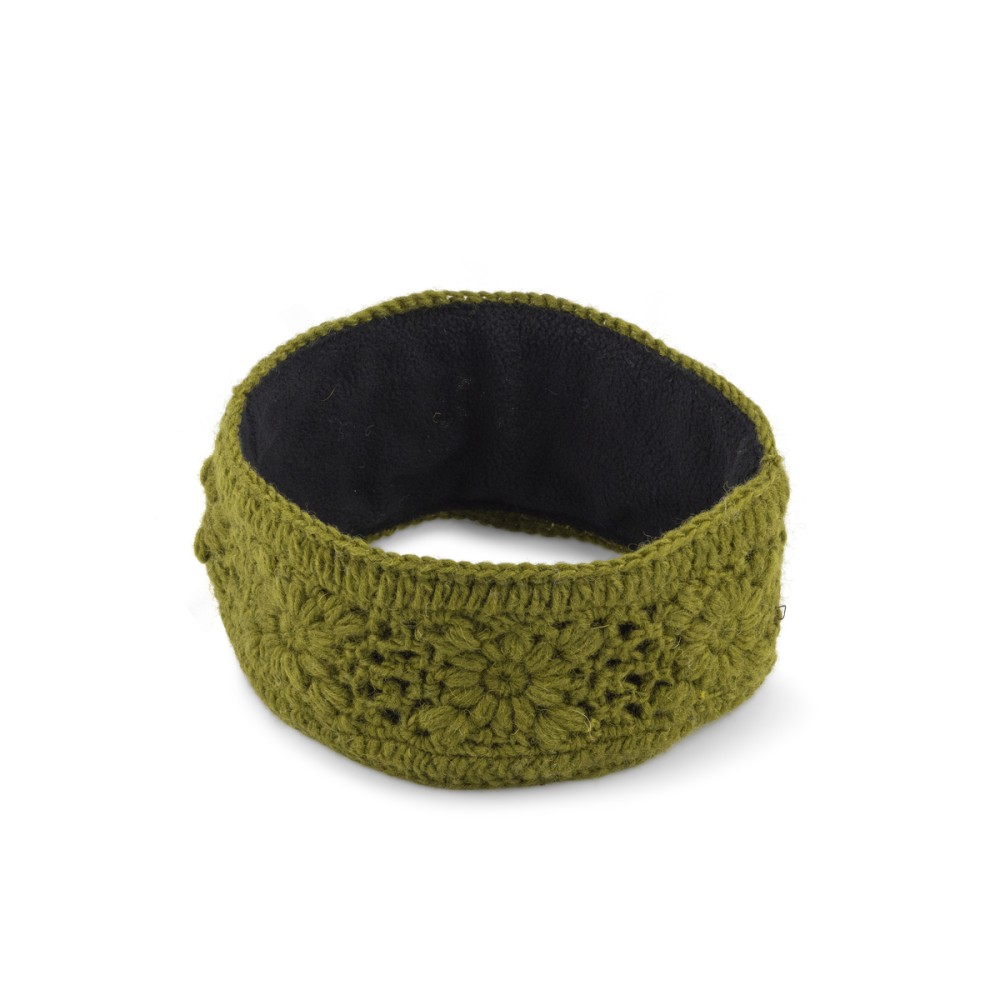 Gehaakte hoofdband van wol met een voering van fleece.