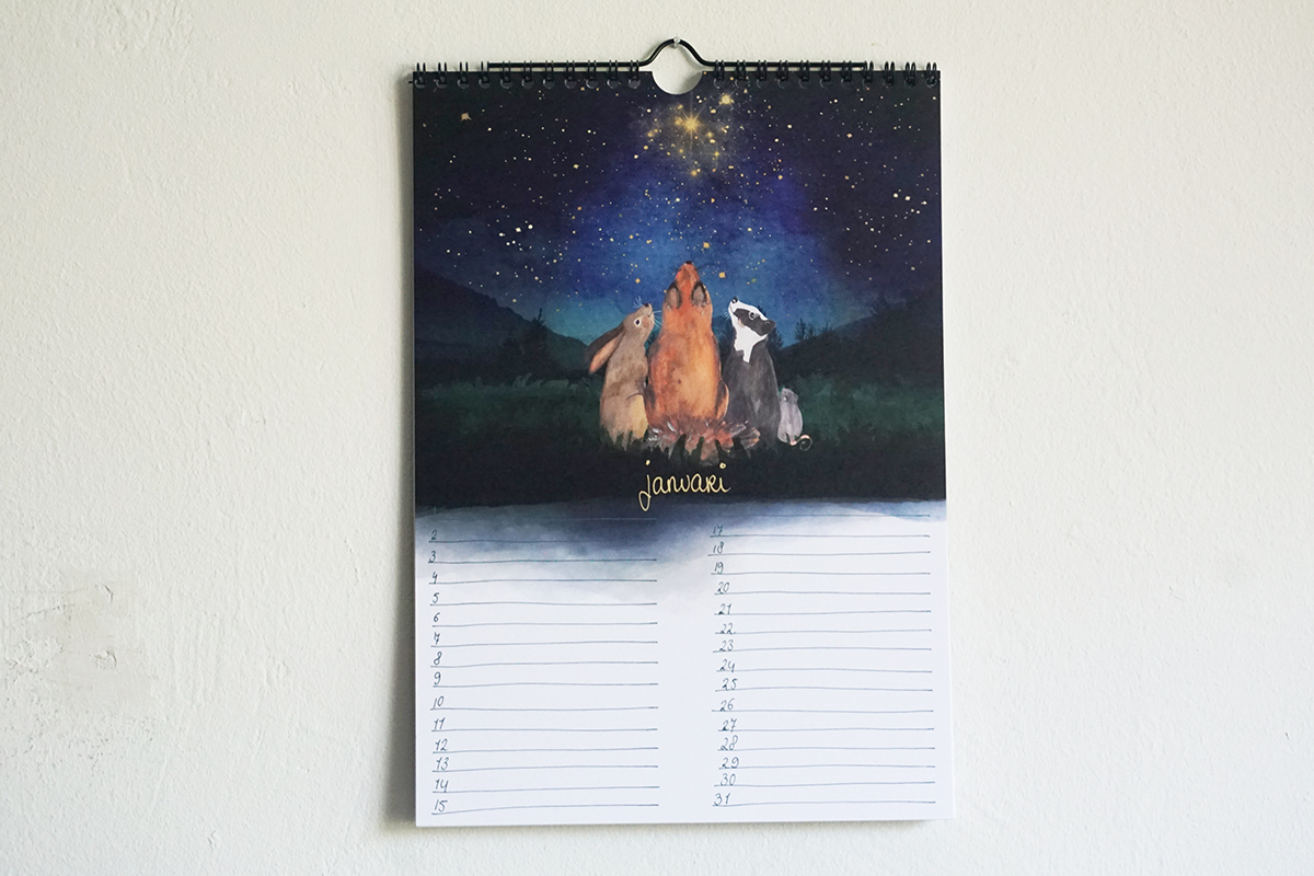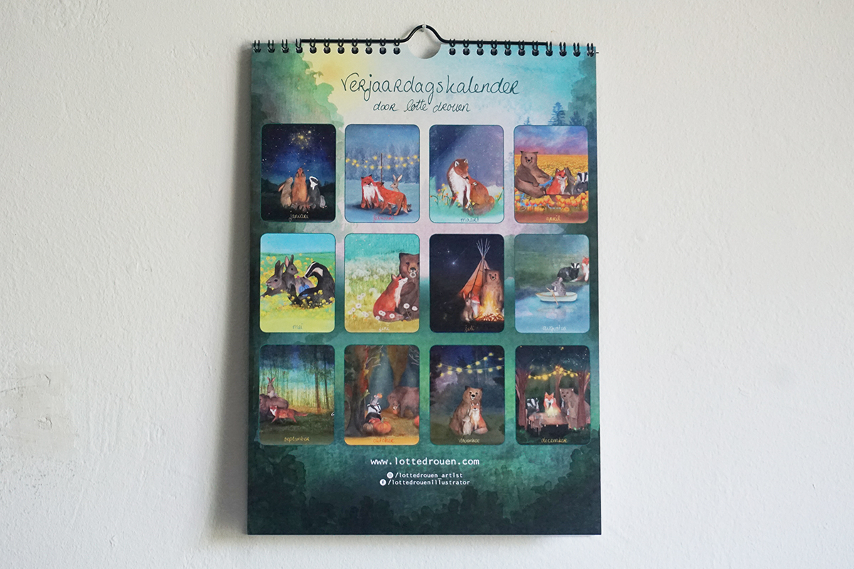 Kalender met 14 pagina’s op professioneel papier en verstevigde voor- en achterkant. Ringband gebonden en een haakje om de kalender op te hangen.